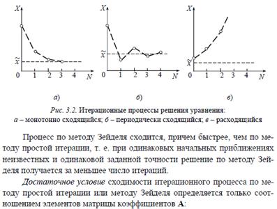 Метод Гаусса прост, нагляден и легко программируется на ЭВМ. Однако его применение не всегда позволяет получить решение с приемлемой точностью либо не позволяет получить его вообще. К причинам возникновения недопустимо большой погрешности относятся округление результатов вычислений и неточность исходных данных (что характерно для инженерных задач), которая в ряде случаев может вызвать несоразмерно большое снижение точности. Итерационные методы решениясистем линейных алгебраических уравнений позволяют получить значения искомых неизвестных в результате многократного выполнения единообразных шагов вычислений, называемых последовательными приближениями, или итерациями. В отличие от прямых методов, решение можно получить только с заданной точностью, причем с увеличением точности растет и число итераций. На рис. 3.2 показан характер изменения итерационной переменной х в зависимости от номера итерации N для случаев сходящегося и расходящегося итерационного процесса.