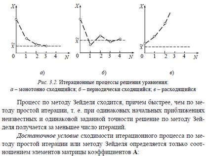 Метод Гаусса прост, нагляден и легко программируется на ЭВМ. Однако его применение не всегда позволяет получить решение с приемлемой точностью либо не позволяет получить его вообще. К причинам возникновения недопустимо большой погрешности относятся округление результатов вычислений и неточность исходных данных (что характерно для инженерных задач), которая в ряде случаев может вызвать несоразмерно большое снижение точности. Итерационные методы решениясистем линейных алгебраических уравнений позволяют получить значения искомых неизвестных в результате многократного выполнения единообразных шагов вычислений, называемых последовательными приближениями, или итерациями. В отличие от прямых методов, решение можно получить только с заданной точностью, причем с увеличением точности растет и число итераций. На рис. 3.2 показан характер изменения итерационной переменной х в зависимости от номера итерации N для случаев сходящегося и расходящегося итерационного процесса.