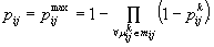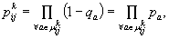 ра - коэффициент готовности (или оперативной готовности) а-го элемента последовательности ребер и вершин, принадлежащих пути qa = (1 - ра) - коэффициент неготовности (или оперативной неготовности) а-го элемента последовательности ребер и вершин, принадлежащего пути Вероятность связности рij от vi к vj - это вероятность исправного состояния хотя бы одной цепи из всех возможных цепей или (при ограничении числа транзитных участков rmax) хотя бы одной цепи с допустимым рангом: В реальных условиях цепи часто взаимозависимы, т.е. имеют общие ребра и вершины. При этом вероятность связности, вычисленная по формуле (Б.2), имеет завышенное значение. Действительное значение получится, если при вычислениях по формуле (Б.2) после раскрытия скобок все члены, имеющие показатели степени больше единицы, заменить на единицу, что соответствует исключению события многократного учета коэффициента готовности (или оперативной готовности) одного ребра или одной вершины. Такое действие обозначают символом Е и называют поглощением. Формула для вычисления связности принимает следующий вид: