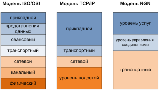 Рисунок 3 – Соответствие эталонной модели ISO/OSI, модели TCP/IP и модели NGN по уровням