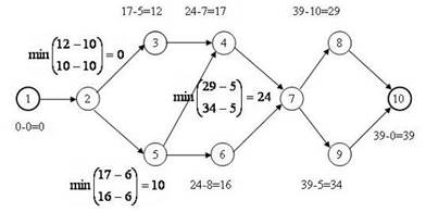 Рис. 2.5. Вычисление позднего времени начала работ Сводные результаты расчетов приведены в табл.2.2. В ней выделены заливкой критические работы. Критический путь получается соединением критических работ на сетевом графике. Он показан пунктирными стрелками на рис.2.6.