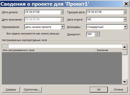 Рис. 3.1. Основные элементы окна Microsoft Project Окно Microsoft Office Project 2007 изображено на рис. 3.1 и состоит из следующих элементов: 1. строка меню; 2. панели инструментов; 3. строка ввода; 4. панель представлений; 5. рабочая область; 6. строка состояния. Строка меню, панели инструментов и строка состояния являются стандартными для всех Windows-приложений, и приемы работы с ними такие же, как и в Microsoft Office. Строка ввода предназначена для ввода и редактирования данных в ячейки таблиц (наподобие строки формул в Excel). Панель представлений используется для переключения между представлениями рабочей области окна. Все данные о проекте хранятся в единой базе данных, состоящей из большого количества полей. Представление – это способ отображения части связанных между собой данных из общей базы данных проекта. В системе реализовано достаточно большое количество представлений – диаграмма Ганта, сетевой график, календарь, график ресурсов и т.д. При желании можно изменять стандартные представления, добавляя или удаляя отображаемые в их таблицах поля данных. При первом запуске программы панель представлений может отсутствовать. Для ее отображения следует выбрать пункт меню ^ Вид/Панель представлений. Переключение между представлениями производится щелчком мыши по значку нужного представления. Рабочая область предназначена для отображения выбранного представления. Она может содержать таблицы, диаграммы, графики, формы и используется как для просмотра, так и для редактирования данных проекта. Приемы работы с рабочей областью зависят от представления и будут рассмотрены в следующих лекциях. Для создания нового проекта следует выбрать пункт меню Файл/Создать. Будет создан пустой проект с пустой базой данных. Прежде всего необходимо задать ключевые параметры проекта в окне сведений о проекте (пункт меню ^ Проект/Сведения о проекте), изображенном на рис. 3.2.. Установки этого пункта имеют определяющее значение для всего последующего процесса планирования.