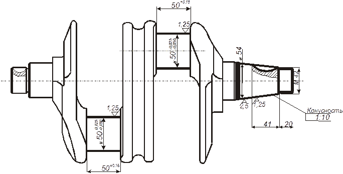 Рисунок 6.1 - Пример разработки маршрута восстановления вала коленчатого 005 Токарная А Установить, закрепить. 1. Точить шатунные шейки в Ø 48, L=50 2. Точить конусную поверхность 1: 10 в Ø 50, в Ø 40, по всей длине. 010 Наплавочная А Установить, закрепить. 1 Наплавить две шатунные шейки с Æ 48 до Æ 54 на L=50 2 Наплавить коническую поверхность 1: 10 Æ 58: 46 3 Наплавить шпоночный паз L 41 015 Токарная. А. Установить, закрепить. 1 Точить две шейки с Æ 54 до Æ 50, 5 на L 50 2 Точить коническую поверхность с Æ 58: 46 до Æ 54, 5: 42, 5 на L 58 3 Калибровать резьбу М 42 020 Разметочная 1 Разметить шпоночный паз в размер чертежа 025 Фрезерная А Установить, закрепить. 1 Фрезеровать шпоночный паз в размеры чертежа 8 x 8, 2 L 41 030 Термическая 1 Закалить наплавленные поверхности ТВЧ 035 Шлифовальная А Установить, закрепить. -0, 025 1 Шлифовать шатунные шейки с Æ 50, 5 до Æ 50-0, 050 на L=50. 2 Шлифовать коническую поверхность с Æ 54, 5: 42, 5 до Æ 54: Æ 42 на L 58