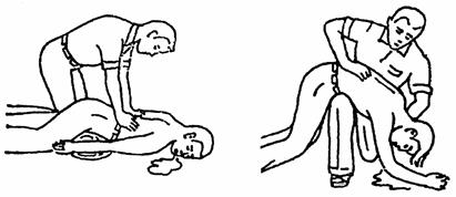 Допомога. При рятуванні потопельника його беруть за волосся, перевертають лицем догори і пливуть, не даючи зачепити себе. Потім якнайшвидше необхідно очистити порожнину рота і глотки потопельника від слизу, мулу та піску. Якщо в дихальних шляхах потерпілого є вода, її необхідно швидко видалити, для чого його перевертають на живіт, перегинають через коліно, щоб голова звисала вниз, і кілька разів натискають на спину (рис. 8.13). Після цього потерпілого перевертають обличчям догори і починають робити оживлення. Коли потопельника врятовано у початковому періоді утоплення, треба насамперед вжити заходів для усунення емоційного стресу: зняти мокрий одяг, досуха обтерти тіло, заспокоїти. Якщо потерпілий непритомний при досить спонтанному диханні, його кладуть горизонтально, піднімають на 40-50о ноги, дають подихати нашатирним спиртом. Одночасно зігрівають потерпілого, проводять штучне дихання, масаж грудної клітки, розтирають руки і ноги.