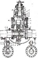 Сур.4.8. Зил-431410 автомобилінің қ ос басты берілісі: 1- конусты тегеріш: 2- білігінің алдың ғ ы конусты тегеріштің мойынтірегі; 3- реттеуші шайбалар; 4- артқ ы конусты, роликті мойынтірек; 5- конусты тісті доң ғ алақ тардың ілінісуін реттеуге арналғ ан тө сем; 6- конусты тегеріш; 7- конусты тісті доң ғ алақ; 8- реттеуші тө семдер; 9- цилиндрлі тегеріштердің конустық роликті мойынтіректері; 10, 19- оң жә не сол жақ мойынтіректерге сә йкес қ ақ пақ тар; 11- цилиндрлі тегеріш; 12- басты берілістің картері; 13- цилиндрлі тісті доң ғ алақ; 14- жарты ө сті тегеріш; 15- дифференциялдың роликті мойынтірегі; 16- дифференциял мойынтірегін реттейтін бұ рандама; 17- жартылай ө сі; 18- белдік картері; 20-таянышты тө лке. Гипойдты тегеріштің тістерін, конустікі сияқ ты элоидты немесе эльвовента шең берінің доғ асы бойынша жасайды. Гипойдты берілісті конусты беріліспен салыстырғ анда бірдей беріктікте габаритті ө лшемі жә не шу дең гейі аз болады. Қ ос басты берілісті жү к кө тергіштігі орташа жә не ү лкен жү ктік автомобильдерде жә не автобустарда қ олданады; мұ ндай беріліс тісті доң ғ алақ тың екі жұ бынан тұ рады: конусты жә не цилиндрлі, сонда ү лкен беріліс саны цилиндрлі жұ пта болады (4.8. Сур).
