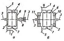 Сур.4.3. Синхронды шарнирлер: а- алты шарнирлі; б- алты жә не тө рт шарикті; в- трехшиповые роликпен; г- дискілі; 1-корпус; 2-сеператор; 3-обойма; 4-шарик; 5-трехшиповая кресовина; 6-ролик; 7-ине; 8-чашка; 9-шип; 10- орталық талық тандырушы қ ұ рылғ ы; 11-вилка; 12-диск Тең бұ рыштық жылдамдық тағ ы (синхронды) кардандар жалғ астырушы біліктердің кез-келген бұ рыштық қ озғ алысында бірдей бұ рыштық жылдамдық пен қ амтамассыз етеді.Синхронды шарнирлер (қ арапайым, ә мбебабы) жұ мыстық элементіне қ арай кардан крестовинасымен еселенген жә не ине тә різді мойынтіректі, алты шарик (4.3, а сур), бес жә не тө рт шарикті (4.3, б сур), трехшиповые роликпен (4.3, в сур) жә не дискілі (12.3, г сур). Жетекші жә не басқ арушы доң ғ алақ тарғ а айналу моментін беру кезінде тең бұ рыштық жылдамдық тағ ы карданды шарнирлерді кө бірек қ олданады. Бұ л жағ дайда біліктер арасындағ ы ү лкен ө згеруші бұ рыш кезінде доң ғ алақ тардың бірдей қ озғ алуын қ амтамассыз етеді. Ө ткізгіштігі жоғ ары автомобилдерде кө бінесе бө лгіш канавкасы жә не бө лгіне иінтірегі бар тең бұ рыштық жылдамдық тағ ы шарикті карданды шарнирлерді орнтады. 4.4-суретте “Вейс” типіндегі бө лгіш канавкасы бар шарикті кардан кө рсетілген. Бір вилканы келесісіне кү штерді беретіншариктер ә рқ ашанда биссекторлы жазық тық та жатады. Кү ш вилкадан вилкіге шарик арқ ылы беріледі, ал қ исық сызық ты канавкаларымен 2 жә не 4 қ озғ алады. Ө зара перпендикуляр жазық тық та жатқ ан вилкаларғ а 1 жә не 5 канавкалар симетриялы орналасқ ан.О1 жә не О2 центрлерінен жү ргізілген канавкалардың орта сызығ ы бірдей радиустағ ы шең бер бө лігін кө рсетеді. Осы центрлердің араса кардан центріне дейігі аралық а бірдей. Канавкалардың ө сі айналу кезінде пп шең берінде ө зара қ иылысатын екі сфералық бетті қ ұ райды, бұ л шариктердің қ озғ алыс траекториясы болып табылады 3. Біліктердің µ бұ рышына орын ауыстыруы кезінде, жалпы вилкадағ ы канавкалардың симметриялы орналасуының салдарынан шариктердің центрі, ә р қ ашанда биссекторлы жазық тық тан табылады.Сағ ат тілінің жү рісімен айналғ ан кезде кү ш шариктердің бір жұ бы арқ ылы беріледі, ал кері бағ ытта, келесі жұ п арқ ылы беріледі.