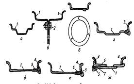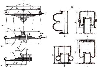 а-неразъемный глубокий симметричный; б- ортасында разъемный; в- триплекс туріндегі сегменті, радиусы бойынша ү ш сегментке бө лінген; г- екі компонентті разъемный; д- ү ш компонентті разъемный; е- бес компонентті; 1- обод негізі 2- жалғ аушы элемент; 3- раземды бортты сақ ина 4- алмалы борттық сақ ина; 5-серіппелі тұ йық тағ ыш сақ ина; 6-қ ондырушы сақ ина; 7-камерасыз шинадағ ы нығ ыздағ ыш. Аспа. Аспа раманы немесе шанақ ты жү рістік бө лімнің агрегаторымен жалғ айды, жолдан келетін динамикалық жү ктемелерді қ абылдайды; автомобилдің жү ріс жайлылығ ын қ амтамассыз етеді. Аспаларғ а келесі талаптар қ ойылады: шанақ тың тиімді тербелесін жә не тербеліс амплитудасының ө шуін қ амтамассыз етеді; бұ рылыс, шапшаң дата қ озғ алу жә не тежелу кезінде автомобиль креніне кері ә сер ету; бағ ыттаушы доң ғ алақ тардың қ ондырғ ысының бұ рышы тұ рақ тандыру; рулдік механизмнің бұ рылысының кинематикасына доң ғ алақ тардың кинематикасының сә йкесуі; сенімділікті, қ ұ рылымының қ арапайымдылығ ын жә не техникалық қ ызметің қ арапайымдылығ ын қ амтамассы ету. Аспаның қ ұ рама бө ліктеріне қ атты элементтер, бағ ыттаушы қ ұ рылғ ылар, амортизаторлар кіреді. Автомобилде аспаның массалары шанақ (рама) жә не оғ ан бекитіндер, аспа массалары емес: доң ғ алақ, аспаның кейбір бө ліктері. Қ атты элементтер жолдан келетін динамикалық жү ктемелерді қ абылдайды. Рессорлы (жапырақ шалы, Витыс серіппелі, торсионды), пневматикалы жә не резің келі (айналуғ а немесе қ ысуғ а жұ мы істейді) қ атты элементтер. Бағ ыттаушы қ ұ рылғ ы бойлық жә не бү йірлік кү штерді жә не моменттерді қ абылдайды. Бағ ыттаушы қ ұ рылғ ының сұ лбасы тә уелді жә не тә уелсіз аспаларды анық тайды. Тә уелсіз аспа кезінде ә р доң ғ алақ тә уелсіз тербеледі. Мұ ндай аспаны ә детте қ иылғ ан белдікте жә не ө тімділігі жоғ ары автомобильдерде жиі қ олданылады. Тә уелді аспада бір доң ғ алақ тағ ы тербеліз белдік арқ ылы екіншісіне беріледі. Бұ л аспаны екі жә не кө п ө сті жү ктік автомобильдерде жә не тіркемелерде кө п пайдаланады.Тә уелді балансирлі аспаларды екі жақ ын орналасқ ан белдік тербейді. Амортизаторлар рессордың, шанақ тың жә не доң ғ алақ тық тербеліс энергиясын ө шіреді. Гидравликалық, газ толтырылғ ан жә не комбинировандық амортизаторлар деп бө леді. Қ ұ рылымдық орындалуына қ арай олар иінтіректі жә не телескопически жасалады. Жү ріс жайлылығ ы шанақ тың (раманың) тербеліс амплитудасы жә не жиілігімен анық талады. Аспаның басқ а элементтері. Жапырақ шалы рессорлар кең інен таралғ ан. Олар дайындауда жә не жө ндеуде қ арапайым. Олардың серіппелі жә не торсионды рессорлардан айырмашылығ ы иінтіреуіш бағ ыттаушы жабдық тары болмайды. Жапырақ шалы рессорлардың ү ш тү рі болады (5.5 сур.): а-жарпылай элипсті; б-кантилеверлі; в-четвертные. Жапырақ шаларды жинау пішімі иіуші моменттердің эппріне сә йкеседі, т.е. рессорлар тең кедергіге қ арсы балқ ы сияқ ты болады.