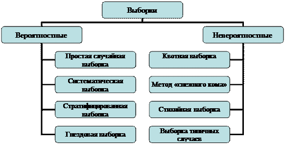 В зависимости от характера организации отбора единиц из генеральной совокупности различается много разновидностей выборок, которые можно классифицировать по трем критериям: - по способу отбора единиц, образующих выборочную совокупность; - по числу ступеней отбора; - по степени преобразования генеральной совокупности. В научной литературе существует множество различных классификаций выборочных обследований. Чаще всего в практике социологических исследований используются следующие виды выборочных совокупностей: