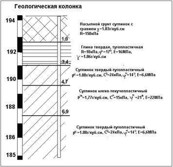 Результаты изысканий представляются в виде отчетов или заключений, в которых должны содержаться выводы, прогнозы и рекомендации, необходимые для разработки проектно-сметной документации. В том числе в отчет входят полученные характеристики грунтов, выполняемые в виде геологической колонки. Вид геологической колонки приведен ниже. Рис. 1. Рис. 1 Геологическая колонка