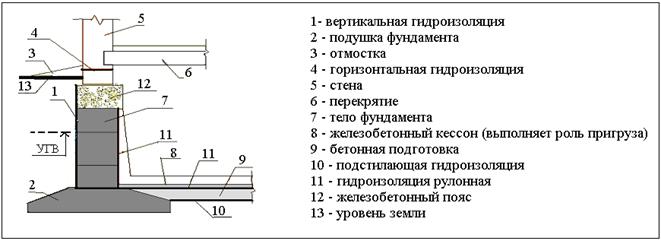 При высоком расположении горизонта грунтовых вод (выше пола подвала) могут потребоваться специальные меры усиления конструкции фундаментов и гидроизоляции, вплоть до устройства герметичных оболочек из металла. Одновременно проводят меры по понижению уровня грунтовых вод (УГВ) – дренирование и т.п. мероприятия.