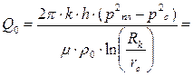Дебіт гідродинамічно досконалої газової свердловини для плоско-радіальної фільтрації можливо визначити за формулою Дюпії: