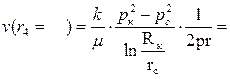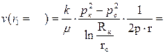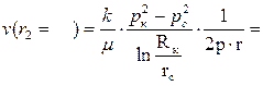 На графіку розподілу тиску показуємо графічно градієнт тиску gradp=Δ p/Δ r (Па/м). Швидкість фільтрації для плоско-радіальної фільтрації на деякій відстані від свердловини обчислюємо за формулою: