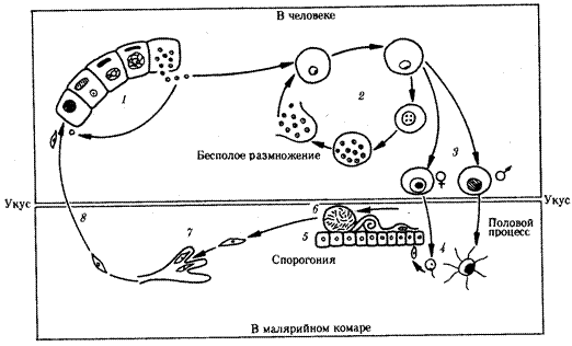 Жизненный цикл малярийного плазмодия: 1 — преэритроцитарная шизогония в клетках печени, 2 — эритроцитарная шизогония, 3 — образование гаметоцитов, 4 — оплодотворение, 5 — спорогония в стенке желудка комара, 6 — овоциста со споромитами, 7 — проникновение спорозоита в слюнные железы комара, 8— заражение человека