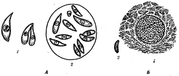 Рис. 19.7. Токсоплазма (Л) и саркоциста (Б): 1 — единичные паразиты, 2 — спорозоиты под общей оболочкой, 3 — изолированная спора, 4— саркоциста в мышечном волокне Токсоплазма поражает огромное количество видов животных и человека. Иммунологические исследования показали, что на Земле токсоплазмами заражено более 500 млн. человек. Жизненный цикл токсоплазмы типичен для споровиков: в нем чередуются стадии шизогонии, гаметогонии и спорогонии. Основные хозяева паразита — домашние кошки и дикие виды сем Кошачьи. Они заражаются, поедая больных грызунов, птиц или инвазированное мясо крупных животных. Паразиты у них сосредоточиваются в клетках кишечника, размножаются шизогонией, а затем образуют гаметы. После копуляции гамет формируются ооцисты, которые выделяются во внешнюю среду. В них происходит спорогония, т. е. деление зиготы под оболочкой. Такие спороцисты со спорозоитами рассеиваются кошками и попадают к промежуточным хозяевам, которыми могут быть человек, почти все млекопитающие, птицы и даже пресмыкающиеся. В клетках большинства их органов происходит бесполое размножение токсоплазм в форме множественного деления. В результате образуются группы, состоящие из многих сотен отдельных паразитов. Эти группы могут распадаться, и тогда отдельные токсоплазмы внедряются с помощью специфической органеллы проникновения — коноида — в непораженные клетки, в которых вновь происходит шизогония. Другие такие группы покрываются плотной оболочкой и формируют цисты. Цисты очень устойчивы и могут длительное время находиться в состоянии покоя в органах хозяев. В окружающую среду они не выделяются. Цикл развития замыкается при поедании кошками органов промежуточных хозяев с цистами. Своеобразной особенностью цикла развития токсоплазм является то, что промежуточные хозяева могут заражаться ими не только от основного хозяина, но и при поедани» друг друга. Так, возможно заражение свиней при поедании ими трупов грызунов, погибших от токсоплазмоза, грызуны же заражаются друг от друга при каннибализме. Возможно и внутриутробное заражение плода от больной беременной самки, когда паразиты проникают через плаценту. Этот способ заражения обеспечивает устойчивое существование природных очагов токсоплазмоза и среди мелких грызунов, не склонных к каннибализму. В соответствии с этим и человек как промежуточный хозяин может заразиться токсоплазмозом разными путями: 1) при поедании мяса инвазированных животных; 2) с молоком и молочными продуктами; 3) через кожу и слизистые оболочки при уходе за больными животными, при обработке шкур и разделке животного сырья; 4) внутриутробно через плаценту; 5) при медицинских манипуляцих переливания крови и лейкоцитарной массы, при пересадках органов, сопровождающихся приемом иммунодепрессивных препаратов. Последнее свидетельствует о том, что общее снижение иммунитета повышает вероятность заражения токсоплазмозом. Обычно паразиты обладают весьма низкой патогенностью, но в некоторых условиях они могут вызвать очень тяжелые нарушения, что зависит как от индивидуальной чувствительности хозяев, так и от путей проникновения токсоплазм в организм человека. Наиболее опасным является трансплацентарное заражение. При этом возможно рождение детей с множественными врожденными пороками развития, в первую очеред