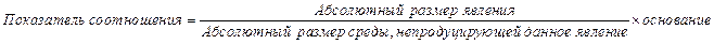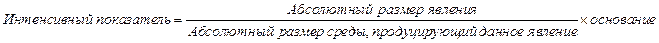 Относительные величины (показатели, коэффициенты) получаются в результате отношения одной абсолютной величины к другой. Наиболее часто используются следующие показатели: а) интенсивные - показатели частоты, интенсивности, распространенности явления в среде, продуцирующей данное явление. В здравоохранении изучаются заболеваемость, смертность, инвалидность, рождаемость и другие показатели здоровья населения. Средой, в которой происходят процессы, является население в целом или его отдельные группы (возрастные, половые, социальные, профессиональные и др.). В медико-статистических исследованиях явление представляет собой как бы продукт среды. Например, население (среда) и заболевшие (явление); больные (среда) и умершие (явление) и т. д.