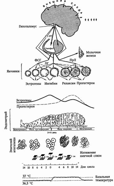 Менструальный цикл - циклические гормональные изменения в организме женщины на уровне кора - гипоталамус - гипофиз - яичники, сопровождающиеся циклическими изменениями в слизистой матки и проявляющиеся менструальными кровотечениями; это сложный ритмически повторяющийся биологический процесс, подготавливающий организм женщины к беременности. Циклические менструальные изменения начинаются в период полового созревания. Первые менструации (menarche) появляются в 12 - 14 лет и продолжаются в детородном возрасте (до 45 - 50 лет). Оплодотворение наступает в середине менструального цикла после овуляции, неоплодотворенная яйцеклетка быстро погибает, слизистая оболочка матки, подготовленная для имплантации яйца, отторгается, возникает менструальное кровотечение. Продолжительность менструального цикла отсчитывается от первого дня прошедшей до первого дня последней менструации. Нормальная продолжительность менструального цикла от 21 до 35 дней, продолжительность менструации в среднем 3-4 дня, до 7 дней, величина кровопотери 50-100 мл. Нормальный менструальный цикл всегда овуляторный. Циклические функциональные изменения в системе гипоталамус-гипофиз-яичники условно объединяются в яичниковый цикл, а циклические изменения в слизистой оболочке матки — в маточный. Одновременно происходят циклические сдвиги во всем организме женщины (менструальная волна), представляющие собой периодические изменения деятельности ЦНС, обменных процессов, функции сердечно-сосудистой системы и терморегуляции. Согласно современным представлениям менструальная функция регулируется нейрогуморальным путем при участии: 1. коры головного мозга - регулирует процессы, связанные с развитием менструальной функции. Через нее осуществляется влияние внешней среды на нижележащие отделы нервной системы, участвующие в регуляции менструального цикла. 2. подкорковых вегетативных центров, расположенных главным образом в гипоталамусе - в нем концентрируется влияние импульсов ЦНС и гормонов периферических желез внутренней секреции, в его клетках содержатся рецепторы для всех периферических гормонов, в т. ч. эстрогенов и прогестерона. Нейрогормоны гипоталамуса, стимулирующие освобождение тропных гормонов в передней доле гипофиза, - рилизинг-факторы (либерины), ингибирующие освобождение тропных гормонов - статины. Нервные центры гипоталамуса продуцируют 6 рилизинг-факторов, которые попадают в кровь, систему полостей третьего желудочка головного мозга, в спинномозговую жидкость, транспортируются по нервным волокнам в гипофиз и приводят к освобождению в передней доле его соответствующих тропных гормонов: 1) соматотропного рилизинг-фактора (СРФ) или соматолиберина 2) адренокортикотропного рилизинг-фактора (АКТГ-РФ) или кортиколиберина 3) тиреотропного рилизинг-фактора (ТРФ) или тиреолиберина 4) фолликулостимулирующего рилизинг-фактора (ФСГ-РФ) или фоллиберина 5) лютеинизирующего рилизинг-фактора (РЛФ) или люлиберина 6) пролактиноосвобождающего рилизинг-фактора (ЛРФ) или пролактолиберина. Отношение к менструальной функции имеют ФСГ-РФ, ЛРФ и ПРФ, которые освобождают в аденогипофизе соответствующие гонадотропные гормоны. Из статинов в настоящее время известны только соматотропинингибирующий фактор (СИФ) или соматостатин и пролактинингибирующий фактор (ПИФ) или п