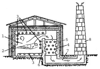 1 – камера сгорания; 2 – горелки; 3 – радиантные трубы; 4 – камера конвекции; 5 – конвекционные трубы; 6 – перевальная стена; 7 – газоход; 8 – дымовая труба Рисунок 1.1 – Принципиальная схема печной установки