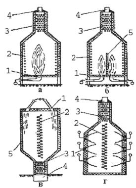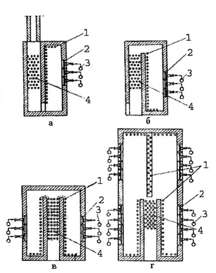 1 – трубный змеевик; 2 – излучающая стена из горелок; 3 – коллектор газа; 4 – конвективная камера; а – печь с боковым расположением конвективной камеры и нисходящим потоком газов в радиантной камере; б – печь с боковым расположением конвективной камеры и восходящим потоком газов в радиантной камере; в – печь с центральным расположением конвективной камеры и восходящим потоком газов в радиантной камере; г – печь двухъярусная с центральным расположением конвективной камеры Рисунок 2.7 – Печи с однорядным настенным экраном и горизонтальным расположением труб