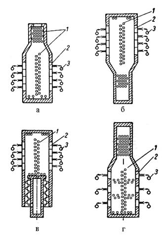 1 – трубный змеевик; 2 – излучающая стена; 3 – коллектор газа; а – печь с верхним расположением конвективного пучка; б – печь с нижним расположением конвективного пучка; в – печь с двумя нижними конвективными пучками; г – печь с дополнительными боковыми экранами Рисунок 2.5 – Печи с двухрядным экраном двухстороннего обогрева и горизонтальным расположением труб