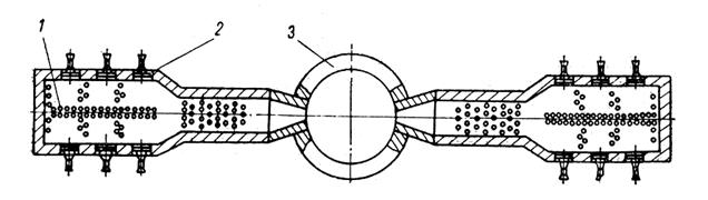 1 – трубный змеевик; 2 – излучающая стена; 3 – дымовая труба Рисунок 2.8 – Печь с двухрядным экраном двустороннего обогрева и вертикальным расположением труб (план)