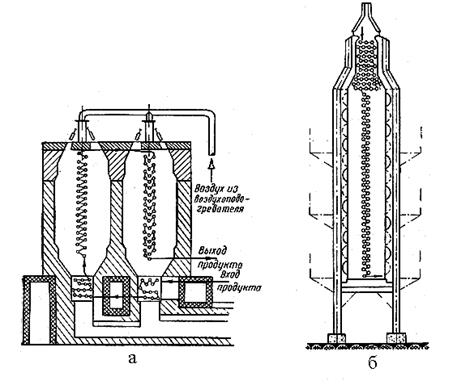 Разновидностью печи с экраном двустороннего облучения является вертикальная печь с газовыми горелками беспламенного горения, изготовленными из специальных сортов керамики, катализирующих процесс горения. Печь представляет собой узкую камеру с экраном двустороннего облучения, в боковых стенах которой установлено большое количество форсунок из керамики (рисунок 2.9, б). Такая конструкция печи делает ее гибкой, так как позволяет регулировать в широких пределах тепловые нагрузки как по высоте, так и по длине экранов. Цилиндрические вертикальные трубчатые печи имеют змеевик из труб, расположенных вертикально в один или два ряда у внутренней поверхности стенки. Конвективная камера располагается вверху и ее трубы могут быть оребренными (коэффициент оребрения равен 3, 2 … 3, 5). В таких печах используют комбинированное газомазутное топливо. Принципиальная схема и технические характеристики некоторых цилиндрических печей приведены в приложении Б [2].