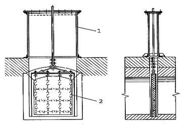 Устройство для достаточно плотного отключения печей от тяговой установки, а также для достижения легкого и чувствительного регулирования количества проходящих из печи газов и их давления называется шибером. Шибер ставится при выходе отходящих газов из камеры печи и представляет собой чугунную или керамическую заслонку, опущенную в газоход и подвешенную на тросе, перекинутом через блок с противовесом или непосредственно на барабан ручной или электрической лебедки. Шибера в газоходах для зоны с температурой дымовых газов до 600º С выполняются из чугуна (рисунок 7.1). Поворотный шибер показан на рисунке 7.2.