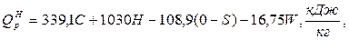 12.2.1 В зависимости от вида топлива и способа выражения его состава (элементарный либо компонентный) используются следующие выражения для определения низшей теплотворной способности (теплоты сгорания) топлива – жидкое топливо (уравнение Менделеева)