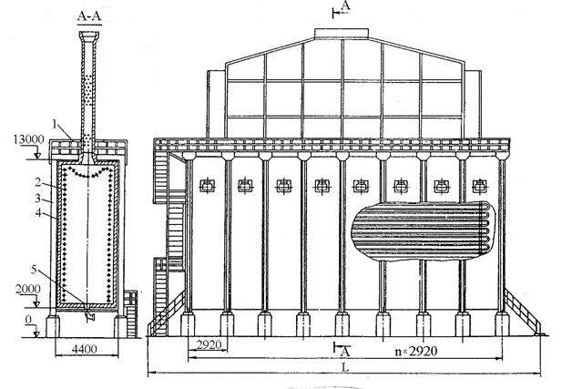 1 – лестничная площадка; 2 – змеевик; 3 – каркас; 4 – футеровка4 5 - горелка Рисунок Б2.1 – Трубчатая печь типа ГС1