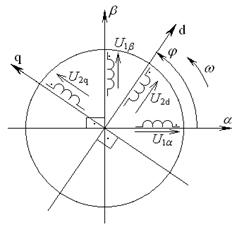 На этой модели электрическая машина представлена в виде неподвижного статора с двумя обмотками, располагающимся вдоль неподвижных координат