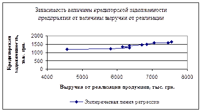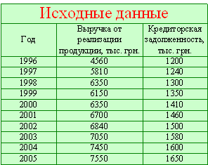 По исходным данным необходимо установить степень взаимосвязи между показателями, построить эмпирическую линию регрессии. Найти члены уравнения регрессии и построить теоретическую линию регрессии и спрогнозировать с помощью найденного уравнения регрессии, а также встроенных статистических функций Excel значения на следующий период. Рассмотрим пример решения задачи корреляционно-регрессионного анализа. Пример: Необходимо определить степень зависимости между выручкой от реализации продукции и величиной кредиторской задолженности предприятия. Построить эмпирическую линию регрессии.