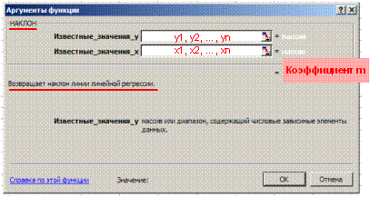 Рисунок 10 – Функции Excel, используемые для нахождения членов уравнения регрессии Из списка функций необходимо выбрать Статистические, в открывшемся списке статистических функций выбираем функцию НАКЛОН для поиска углового коэффициента линии регрессии (m). В открывшемся диалоговом окне в поле Известные значения у вводим ссылки на ячейки, содержащие данные, соответствующие у. В поле Известные значения х вводим ссылки на ячейки, содержащие данные, соответствующие х. Вид диалогового окна функции НАКЛОН представлен на рис.11.
