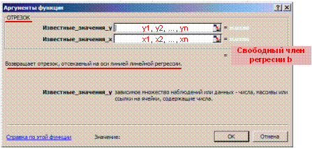 Аналогичным образом поступаем для нахождения свободного члена уравнения регрессии (b). В данном случае в списке статистических функций выберем функцию ОТРЕЗОК. Вид диалогового окна функции ОТРЕЗОК представлен на рис.12.