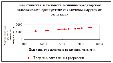 Рисунок 13 – Зависимость величины кредиторской задолженности от выучки от реализации 4-й шаг: Подставив в полученное уравнение регрессии значения х, найдем т.н. «теоретические» значения у. По полученным данным построим теоретическую линию регрессии, используя в качестве значений у полученные «теоретические» значения (см. рис. 14).