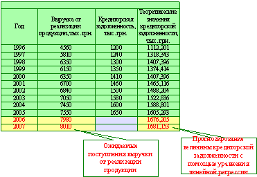 5-й шаг: С помощью встроенных функций ПРЕДСКАЗ или ТЕНДЕНЦИЯ спрогнозируем значения выручки и кредиторской задолженности на 2006 и 2007 год.