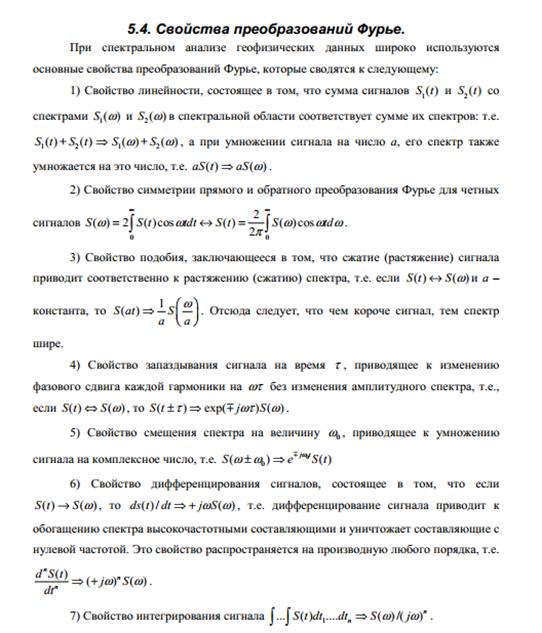 7. Преобразование Фурье. Спектры и их свойства Под преобразованием Фурье понимается разложение сигнала по периодическим функциям синусов и косинусов. Спектр – это функция, описывающая распределение амплитуд и фаз по различным частотным составляющим (гармоникам) сигнала, начиная с низкочастотных и кончая высокочастотными составляющими. Суммирование частотных составляющих с учетом их амплитуд и фаз приводит к восстановлению формы сигнала. Практическое применение анализа Фурье при обработке геофизических данных связано с их представлением в виде сигналов, заданных в дискретных точках наблюдений, т.е. S (Х= r∆)= Sr или S(t= r∆ t)= Sr. Построение спектров дискретно заданного сигнала основано на теореме о том, что любую непрерывную периодическую функцию, удовлетворяющую условиям Дирихле (функция ограничена и имеет конечное число разрывов, т.е. любые геофизические данные удовлетворяют этим условиям) можно представить в виде конечного ряда Фурье: