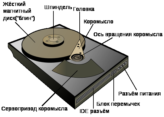 1. Отдельно взятое устройство из класса периферийных устройств компьютера. Класс периферийных устройств появился в связи с разделением вычислительной машины на вычислительные (логические) блоки - процессор(ы) и память хранения выполняемой программы и внешние, по отношению к ним, устройства, вместе с подключающими их интерфейсами. Таким образом, периферийные устройства, расширяя возможности ЭВМ, не изменяют её архитектуру. 2. Периферийными устройствами также можно считать внешние по отношению к системному блоку компьютера устройства. Устройства дисковой системы ЭВМ Накопитель на жёстких магнитных дисках или НЖМД (англ. hard (magnetic) disk drive, HDD, HMDD), жёсткий диск, в компьютерном сленге «винчестер», «винт», «хард», «харддиск» — устройство хранения информации, основанное на принципе магнитной записи. Является основным накопителем данных в большинстве компьютеров. Жёсткий диск состоит из гермозоны и блока электроники.
