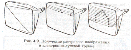 Файлу всегда выделяется целое число кластеров. Например, текстовый файл, содержащий слово " информатика", составляет всего 11 байтов, но на диске этот файл будет занимать целиком кластер, то есть 640 Кбайт дискового пространства для диска емкостью 150 Гбайт. При размещении на жестком диске большого количества небольших по размеру файлов они будут занимать кластеры лишь частично, что приведет к большим потерям свободного дискового пространства. Эта проблема частично решается с помощью использования таблицы FAT32, в которой объем кластера принят равным 8 секторам или 4 килобайтам для диска любого объема. В целях более надежного сохранения информации о размещении файлов на диске хранятся две идентичные копии таблицы FAT. Преобразование FAT16 в FAT32 можно осуществить с помощью служебной программы Преобразование диска в FAT32, которая входит в состав Windows. Принципы работы видеоадаптера и монитора Прежде чем стать изображением на мониторе, двоичные цифровые данные обрабатываются центральным процессором, затем через шину данных направляются в видеоадаптер, где они обрабатываются и преобразуются в аналоговые данные и уже после этого направляются в монитор и формируют изображение. Сначала данные в цифровом виде из шины попадают в видеопроцессор, где они начинают обрабатываться. После этого обработанные цифровые данные направляются в видеопамять, где создается образ изображения, которое должно быть выведено на дисплее. Затем, все еще в цифровом формате, данные, образующие образ, передаются в RAMDAC, где они конвертируются в аналоговый вид, после чего передаются в монитор, на котором выводится требуемое изображение. Существуют мониторы, основанные на разных физических принципах. Самыми распространенными являются мониторы на основе электроннолучевой трубки - ЭЛТ-мониторы. На экране такого монитора пиксель образуется люминесцирующим веществом, которое светится под воздействием луча, испускаемого электронной пушкой. Такой луч пробегает по порядку (сканирует) все строки сетки пикселей. При этом он модулируется: на точки, которые должны светиться, падает, а на темных точках прерывается (рис. 4.9). Поскольку после прекращения воздействия электронного луча на точку экрана ее свечение быстро затухает, то сканирование периодически повторяется с высокой частотой (75-85 раз в секунду и более). При такой частоте наше зрение не замечает мерцания изображения.