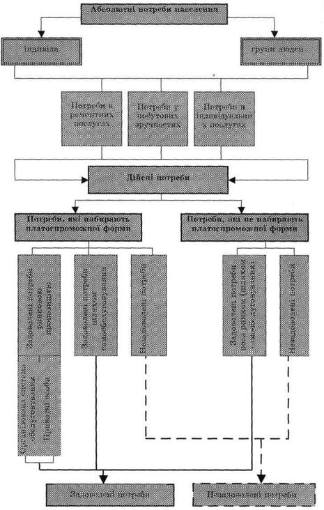 Отже, враховуючи класифікацію побутових послуг М.Б. Росинського та класифікацію потреб у побутових послугах В.І. Дмитрієва, задоволення потреб у побутових послугах необхідно вивчати за трьома групами: потреби в ремонтних послугах; - потреби у побутових зручностях (фотопослугах та послугах прокату); - потреби в індивідуальних послугах. Для успішної раціоналізації найбільш повного задоволення потреб населення необхідна їх класифікація залежно від можливостей задоволення. Такої класифікації дотримуються Баранова Л.Я. і Лєвін А.І. [15, с.25] та В.І. Дмитрієв [8, с.46]: - абсолютні потреби - не обмежені доходами споживачів, мають абстрактний характер і не пов'язані з конкретним предметом споживання; - дійсні потреби - не обмежені платоспороможними можливостями споживачів, мають конкретний характер і спрямовані на певні побутові послуги; - платоспроможні потреби - визначаються платоспроможними можливостями споживачів, мають абстрактний характер і відображають бажання отримати послуги взагалі; - задоволені потреби - потреби, які фактично задоволені послугами, які існують на ринку, що залежить від платоспроможних можливостей споживача. З даною класифікацією ми погоджуємося, оскільки саме вона дає змогу показати можливість задоволення потреб, які в даній класифікації досить тісно взаємопов'язані між собою, оскільки абсолютні потреби залежно від сфери життєдіяльності перетворюються в дійсні. Вони, в свою чергу, у результаті розподілу послуг набирають форми платоспроможних, які виносяться на ринок і задовольняються завдяки споживанню послуг. Але, на нашу думку, таку класифікацію можна розширити, оскільки дійсні потреби можуть набирати форми платоспроможних і можуть не набирати її. А поряд із задоволеними потребами можуть існувати незадоволені, які виникають внаслідок недостатньої кількості послуг на ринку, обмеження грошових засобів, неможливістю задоволення потреб шляхом самообслуговування, дефіциту вільного часу, відсутністю необхідних частин для ремонту і т.д. Щодо потреб у побутових послугах, які набирають платоспроможної форми, їх можна поділити [8, с. 54]: - потреби, які задоволенні ринковою пропозицією; - потреби, які задовольняються шляхом самообслуговування; незадоволені платоспроможні потреби. Перші дві групи потреб В.І. Дмитрієв прокласифікував залежно від зв'язку з товарно-грошовими відносинами, які поділяють на ринкові та неринкові. Ринкові послуги представляють собою потреби, які задовольняються в системі побутового обслуговування, і потреби, які задовольняють приватні особи. Неринкові потреби задовольняються в процесі самообслуговування і не виходять за межі особистого споживання. У зв'язку з цим потреби у побутових послугах класифікують за каналами задоволення [8, с.31]: - потреби, які задовольняються в організованій системі обслуговування; - потреби, які задовольняються приватними особами; - потреби, які задовольняються шляхом самообслуговування. Потреби, які задовольняються в організованій системі обслуговування, мають " товарний підхід" [8, с.23], тобто проявляються в товарній формі і, отже, надходять в споживання через обмін. З даного твердження випливає, що споживання таких послуг відбувається лише в одній формі - формі організованої системи обслуговування, тобто на базі ательє, майстерень, сітки комплексних 