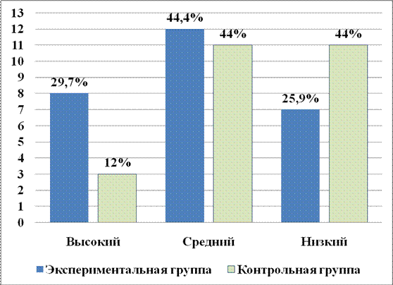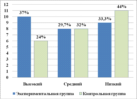 В экспериментальной группе на высокий уровень перешло 6 испытуемых (Алёна Т., Станислава М., Полина Т., Яна С., Милана Х., Полина Т.), а с низкого на средний поднялись 4 учащихся (Артём Х., Ильнар З., Никита Ш. и Денис С.). В контрольной группе на высокий уровень перешли только 2 человека – Катя Б. и Миша С., а с низкого на средний поднялись также 2 испытуемых (Серёжа М. и Вика Д.).