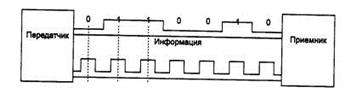 При использовании прямоугольных импульсов для передачи дискретной информации необходимо выбрать такой способ кодирования, который одновременно достигал бы нескольких целей: · имел при одной и той же битовой скорости наименьшую ширину спектра результирующего сигнала; · обеспечивал синхронизацию между передатчиком и приемником; · обладал способностью распознавать ошибки; · обладал низкой стоимостью реализации. Более узкий спектр сигналов позволяет на одной и той же линии (с одной и той же полосой пропускания) добиваться более высокой скорости передачи данных. Кроме того, часто к спектру сигнала предъявляется требование отсутствия постоянной составляющей, то есть наличия постоянного тока между передатчиком и приемником. В частности, применение различных трансформаторных схем гальванической развязки препятствует прохождению постоянного тока. Синхронизация передатчика и приемника нужна для того, чтобы приемник точно знал, в какой момент времени необходимо считывать новую информацию с линии связи. Эта проблема в сетях решается сложнее, чем при обмене данными между близко расположенными устройствами, например между блоками внутри компьютера или же между компьютером и принтером. На небольших расстояниях хорошо работает схема, основанная на отдельной тактирующей линии связи (рис. 2.15), так что информация снимается с линии данных только в момент прихода тактового импульса. В сетях использование этой схемы вызывает трудности из-за неоднородности характеристик проводников в кабелях. На больших расстояниях неравномерность скорости распространения сигнала может привести к тому, что тактовый импульс придет настолько позже или раньше соответствующего сигнала данных, что бит данных будет пропущен или считан повторно. Другой причиной, по которой в сетях отказываются от использования тактирующих импульсов, является экономия проводников в дорогостоящих кабелях.