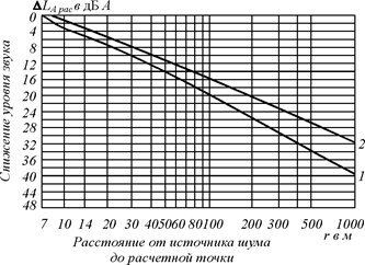 Рис. 26. График для определения снижения уровня звука в дБА в зависимости от расстояния между источником шума и расчетной точкой 1 - источники шума внутри групп жилых домов, трансформаторы; 2 - транспортные потоки, железнодорожные поезда