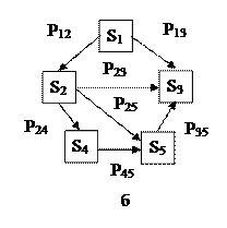 Умова (4.1) - звичайна властивість вірогідності, а умова (4.2) означає, що система S обов'язково або переходить з якогось стану Si в інший стан, або залишається в стані Si. Елементи pij матриці P означають вірогідність переходів в системі за один крок. Зазвичай на графі вірогідності переходу системи з одного стану в те ж саме не відзначаються. При розгляді конкретних систем зручно спочатку побудувати граф станів, потім визначити вірогідність переходів системи з одного стану в те ж саме (виходячи з вимоги рівності одиниці суми елементів рядків матриці), а потім скласти матрицю переходів системи.