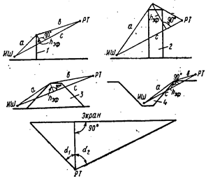 Рис. 27. Расчетные схемы для определения снижения уровня звука за экранами 1 - стенка; 2 - здание; 3 - насыпь; 4 - выемка; ИШ - источник шума; РТ - расчетная точка; h эф - эффективная высота экрана