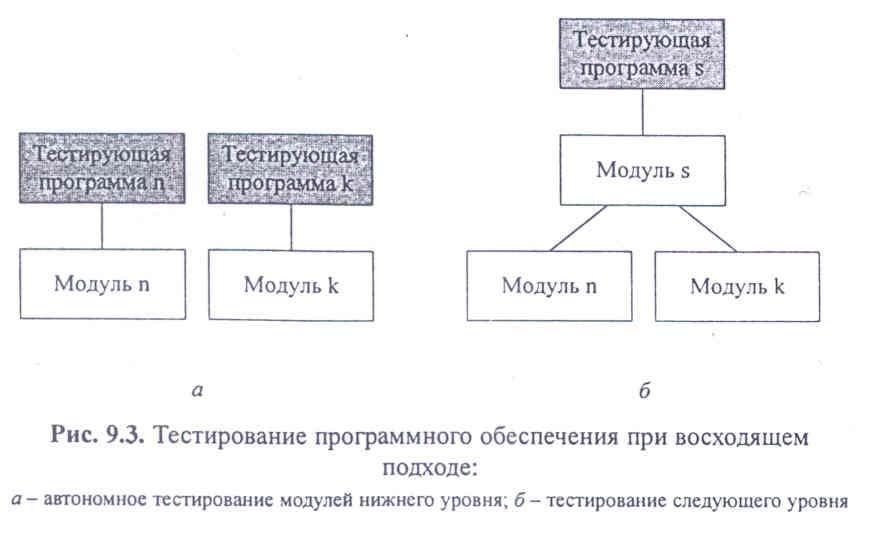 Восходящее тестирование. Восходящий подход предполагает, что каждый модуль тестируютотдельно на соответствие имеющимся спецификациям на него, затем собирают оттестированные модули в модули более высокой степени интеграции и тестируют их. При этом проверяют межмодульные интерфейсы, используемые для подключения модулей более низкого уровня ие-рархии. И так далее, пока не будет собран весь программный продукт (рис. 9.3).
