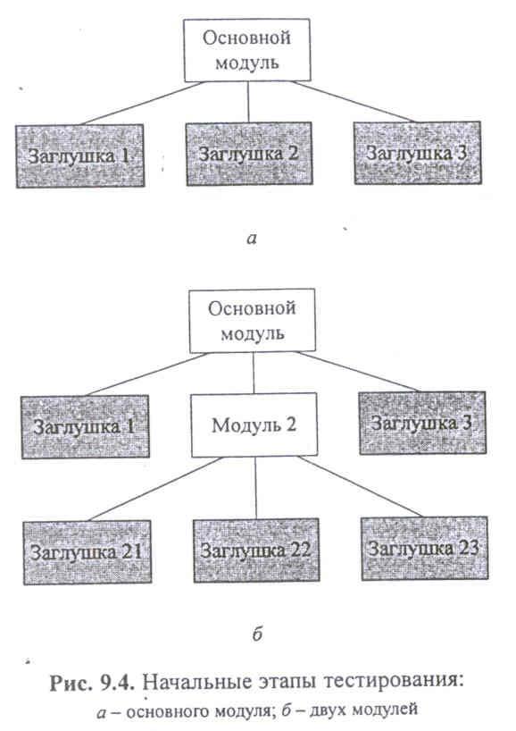 В этом случае автономно тестируется только основной модуль. При его тестировании все вызываемые им модули заменяют модулями, которые в той или иной степени имитируют поведение вызываемых модулей (рис. 9.4). Такие модули принято называть «заглушками». В отличие от тестирующих программ заглушки очень просты, например, они могут просто фиксировать, что им передано управление. Часто заглушки просто возвращают какие-либо фиксированные данные.