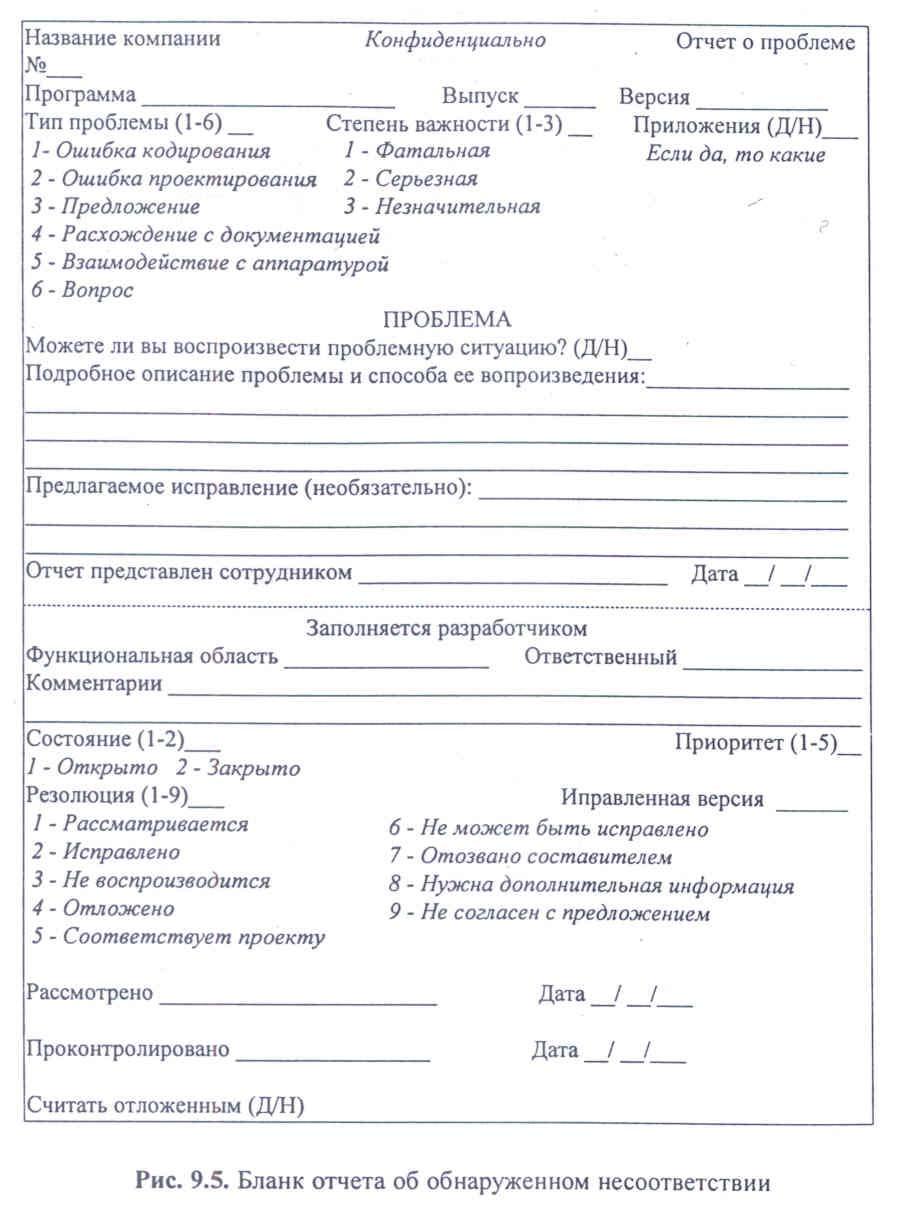 Задачей специалиста по тестированию является обнаружение максимального количества несоответствий тестируемого модуля и спецификаций на него. Для выполнения этой задачи специалист по тестированию формирует тесты, используя как структурный, так и функциональный подходы, обеспечивая всестороннее тестирование. Каждое отклонение от спецификации обязательно документируют, заполняя специальный протокол (рис. 9.5). Наиболее интересными полями протокола являются тип проблемы и ее описание.