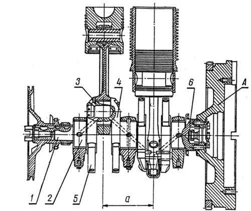 1 – вал колінчастий; 2 – шийка корінна; 3 – шийка шатунна; 4 – щока; 5 – противага; 6 – флянець
