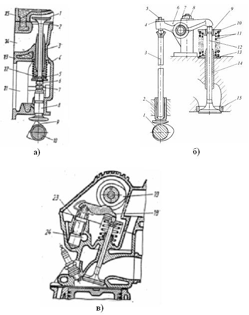 Газорозподільний механізм (ГРМ) – служить для своєчасного впуску в циліндри двигуна свіжого заряду і для випуску відпрацьованих газів. В залежності від типу органів, за допомогою яких циліндр сполучається з навколишнім середовищем, механізми газорозподілу ділять на золотникові, комбіновані і клапанні. Золотниковий ГРМ застосовується в двотактних двигунах з контурними і щілинними схемами продувки, де порожнина циліндра сполучається з навколишнім середовищем через вікна в його стінці, що відкриваються і закриваються поршнем. Комбінований ГРМ застосовується з прямоточною клапанно-щілинною продувкою. Свіжий заряд поступає в циліндр через вікна в його стінці, а відпрацьовані гази видаляються за допомогою клапанів. Клапанний ГРМ основний тип механізмів газорозподілу, що застосовується в автотракторних ДВЗ. Він характеризується простотою конструкції, малою вартістю виготовлення і ремонту, якісним ущільненням робочої порожнини циліндра і надійністю роботи. Якщо клапани розміщені в блок-картері і відкриваються при русі вгору (в напрямку від колінчатого вала) то їх називають нижніми(боковими) клапанами. (рис. 3.4. а) Нижнє розміщення клапанів застосовується тільки у карбюраторних двигунах з порівняно низькою ступінню стиску і невисокою частотою обертання колінчатого вала (ГАЗ-52, ГАЗ-69, УАЗ-450, ЗІЛ-157). Верхні (підвісні) клапани (рис. 3.4. б) розміщені на головці блока і відкриваються при русі вниз (в напрямку до колінчатого вала). Верхнє розміщення клапанів дає можливість зменшити довжину впускних і випускних каналів, в результаті чого знижуються втрати на впуску і випуску, покращується наповнення циліндрів свіжим зарядом і їх очищення від відпрацьованих газів. Це дає можливість підвищити потужність і економічність двигуна, а також значно розширити можливості форсування по швидкісному режиму. Верхнє розміщення розподільного вала (рис. 3.4. в) дозволяє зменшити масу і збільшити жорсткість механізму приводу клапанів і покращити наповнення двигуна завдяки компактній формі впускних і випускних клапанів.