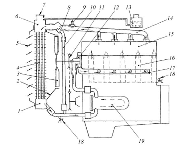 Рис.5.2. Схема системи рідинного охолодження ДВЗ: 1 – нижній бачок радіатора; 2 – кожух направляючий; 3 – вентилятор; 4 – серцевина радіатора; 5 – жалюзі; 6 – верхній бачок радіатора; 7 – кришка заливної горловини; 8 – термостат; 9 – датчик температури 10 – канал обвідний; 11 – шків; 12 – насос; 13 – бачок розширювальний; 14 – колектор збірний; 15 – рубашка охолодження головки блока; 16 - рубашка охолодження циліндрів; 17 - трубопровід розподільний; 18 – кран зливний; 19 - водомаслообмінник