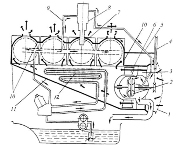 Рис.5.3. Схема системи повітряного охолодження ДВЗ: 1 – забірна сітка; 2 – гідромуфта приводу вентилятора; 3 – апарат напрямний; 4 – шків; 5, 9 - трубопроводи; 6 – вентилятор; 7 – термодатчик; 8 – клапан; 10 – дефлектор; 11 – напрямний кожух; 12 – радіатор масляний
